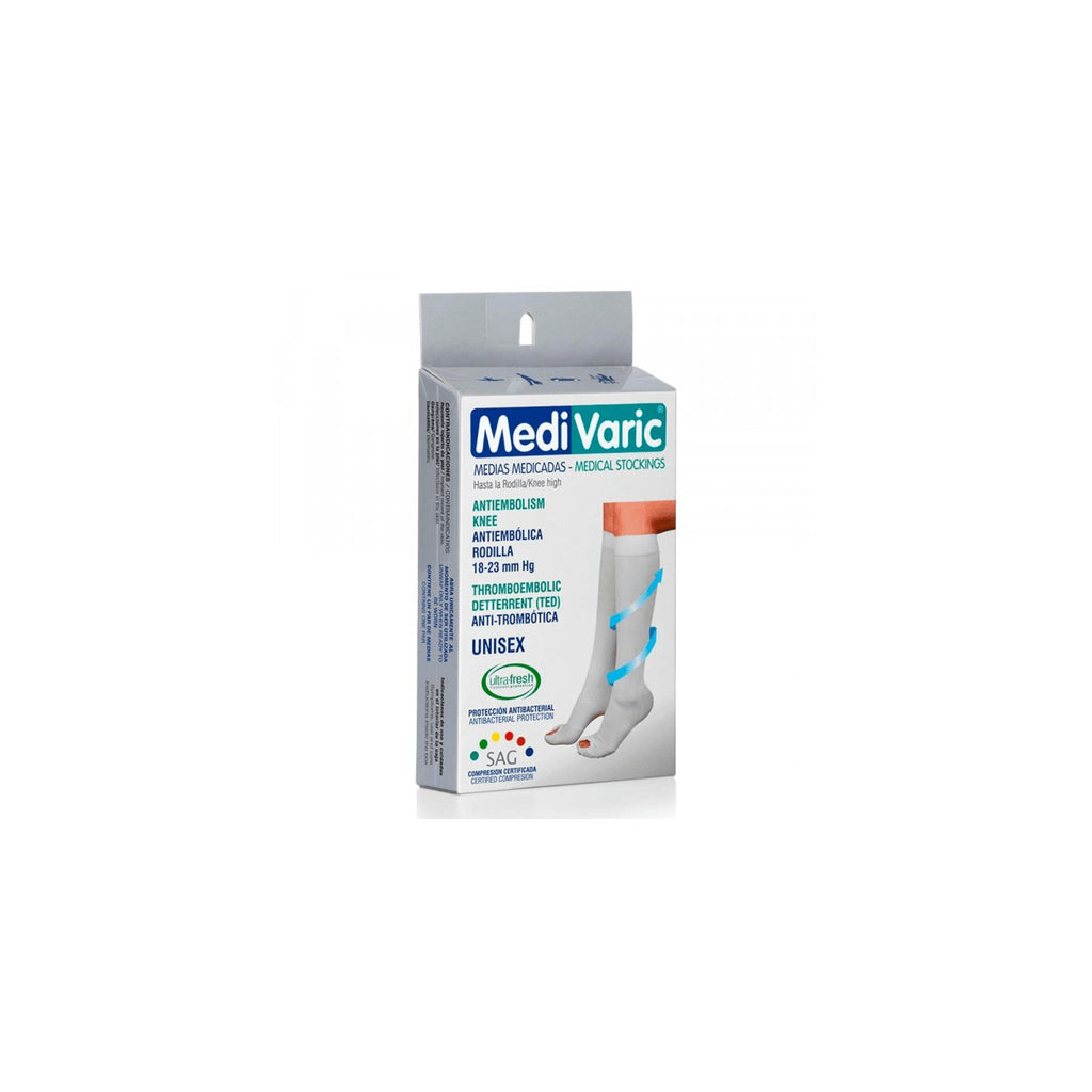 La Media de Compresión Antiembólica Unisex Rodilla, modelo 4463 de la reconocida marca MEDIVARIC, es un producto diseñado específicamente para ofrecer una compresión descendente uniforme de 18-23 mmHg a nivel del tobillo. Su principal beneficio es la prevención de eventos tromboembólicos, así como el tratamiento de condiciones como el edema y la varicotrombosis. Este producto es ideal para pacientes con riesgo moderado y alto de desarrollar trombosis venosa profunda, así como para aquellos que se encuentran en recuperación post-quirúrgica de rodilla y cadera, y como coadyuvante en el tratamiento de injertos de piel.
