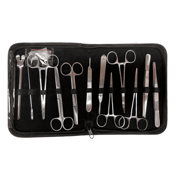 Contiene los instrumentos necesarios para realizar disecciones. Todas sus piezas están fabricadas en acero inoxidable y vienen en un práctico estuche con cremallera para almacenarlas.